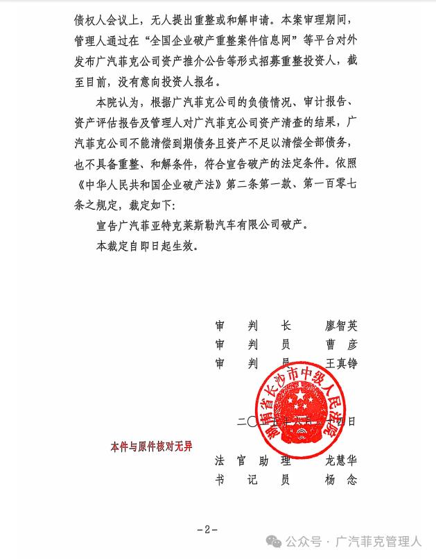 因廣汽菲克公司已無(wú)重整可能,根據(jù)部分債權(quán)人意見(jiàn),經(jīng)債權(quán)人委員會(huì)討論,管理人已經(jīng)申請(qǐng)長(zhǎng)沙中院裁定宣告廣汽菲克公司破產(chǎn)。附:長(zhǎng)沙中院《民事裁定書》(2022)湘01破214號(hào)-2號(hào)。