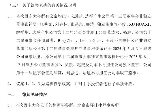 北京市環(huán)球律師事務(wù)所見證律師劉勁容、祝芹、程燁玲對會議進(jìn)行見證,并出具法律意見書。該所律師認(rèn)為,本次股東大會的召集、召開程序,出席人員資格、召集人資格以及表決程序均符合《公司法》、《上市公司股東大會規(guī)則》及《公司章程》的規(guī)定,表決結(jié)果合法有效。