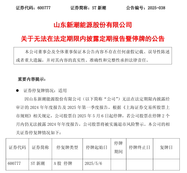 4月30日,公司披露關(guān)于無法在法定期限內(nèi)披露定期報(bào)告暨停牌的公告。按照相關(guān)規(guī)定,公司在股票停牌后兩個月內(nèi)仍未披露2024年年度報(bào)告的,將被實(shí)施退市風(fēng)險(xiǎn)警示;如公司股票交易被實(shí)施退市風(fēng)險(xiǎn)警示之日起兩個月內(nèi)仍未披露過半數(shù)董事保證真實(shí)性、準(zhǔn)確性和完整性的2024年年度報(bào)告,公司股票將被終止上市。
