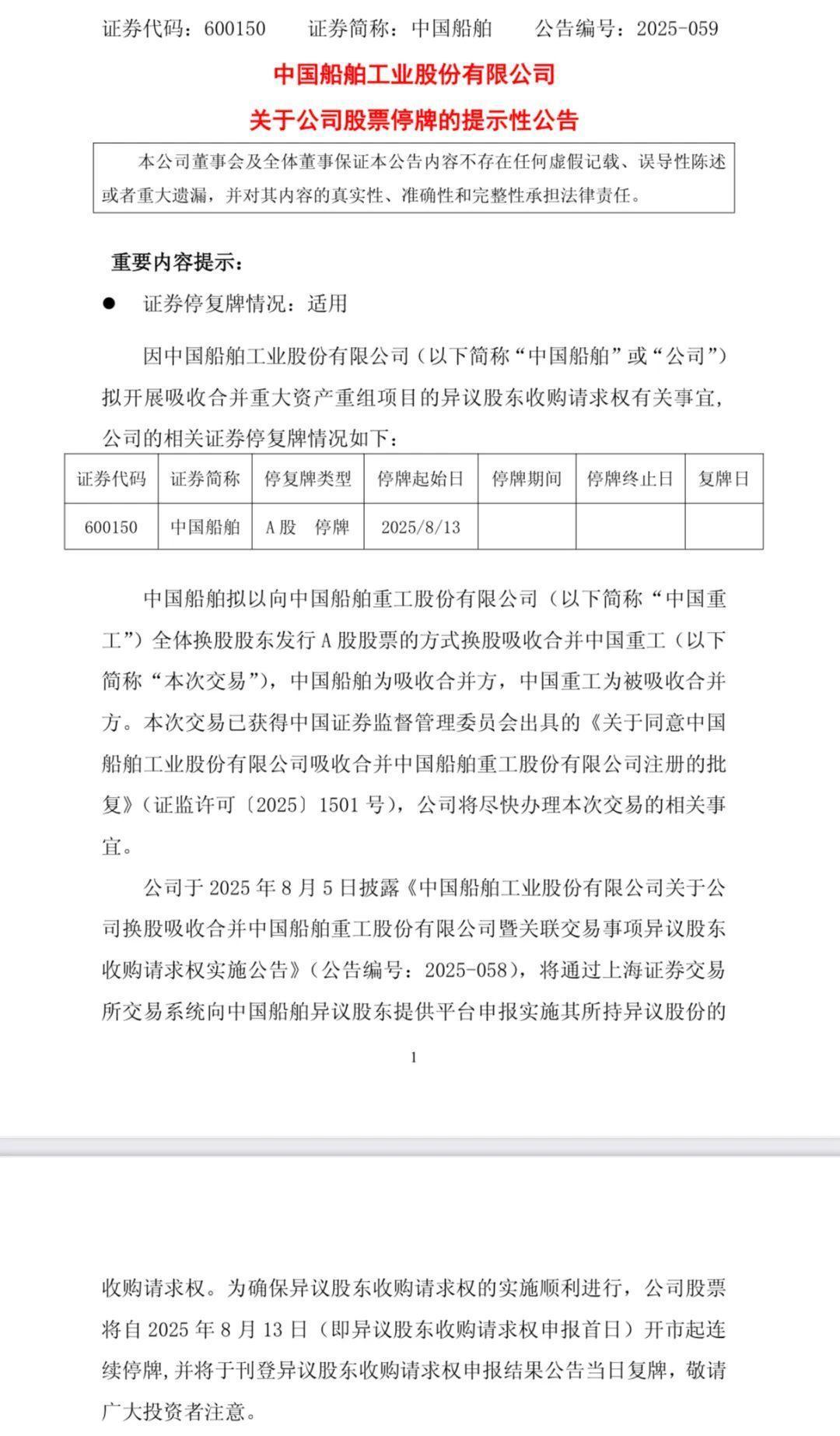 8月4日晚間,中國(guó)船舶發(fā)布公告稱,公司擬開(kāi)展吸收合并重大資產(chǎn)重組項(xiàng)目的異議股東收購(gòu)請(qǐng)求權(quán)有關(guān)事宜,公司股票將自2025年8月13日開(kāi)市起連續(xù)停牌,并將于刊登異議股東收購(gòu)請(qǐng)求權(quán)申報(bào)結(jié)果公告當(dāng)日復(fù)牌。