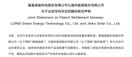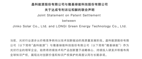 聲明以中英雙語呈現(xiàn),稱隆基綠能與晶科能源聯(lián)合宣布,就雙方及雙方關(guān)聯(lián)公司在全球范圍內(nèi)正在進行的相關(guān)專利主張和法律事項,達(dá)成和解協(xié)議。