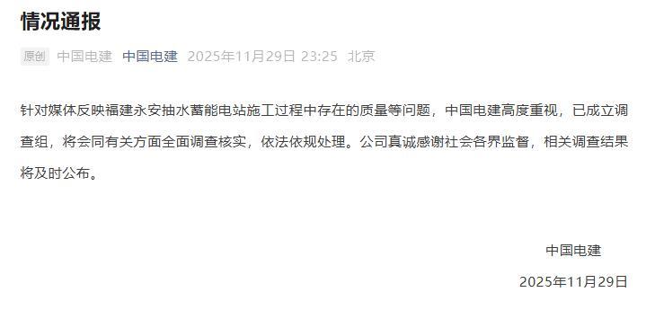 央視網(wǎng)消息:據(jù)中國電建微信公眾號消息,中國電建11月29日晚發(fā)布情況通報,針對媒體反映福建永安抽水蓄能電站施工過程中存在的質(zhì)量等問題,中國電建高度重視,已成立調(diào)查組,將會同有關方面全面調(diào)查核實,依法依規(guī)處理。公司真誠感謝社會各界監(jiān)督,相關調(diào)查結(jié)果將及時公布。
