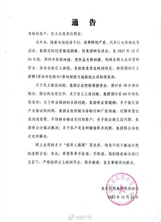 東安集團(tuán)稱,近年來,汽車行業(yè)價格戰(zhàn)等因素,集團(tuán)實(shí)際經(jīng)營情況困難,經(jīng)集團(tuán)研究決定,自2025年12月26日起,鄭州中原保時捷、貴陽孟關(guān)保時捷、鄭州東錦大眾店暫停營業(yè)。