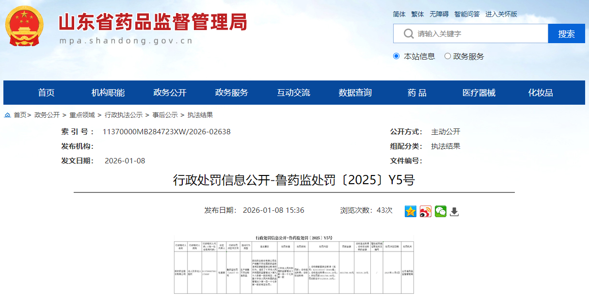 1月8日,山東省藥品監(jiān)督管理局官網(wǎng)發(fā)布的處罰信息顯示,辰欣藥業(yè)股份有限公司(下稱辰欣藥業(yè))因生產(chǎn)銷售不符合標(biāo)準(zhǔn)藥品,被罰沒312.5萬元。