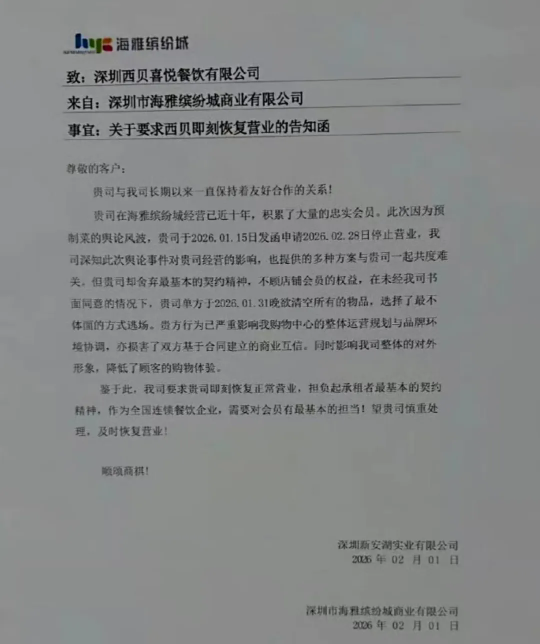 該告知函顯示,因?yàn)轭A(yù)制菜的輿論風(fēng)波,西貝喜悅餐飲于2026年1月15日向海雅繽紛城發(fā)函,申請(qǐng)2026年2月28日停止?fàn)I業(yè)。為一起度過難關(guān),該商城提供了多種方案給西貝喜悅餐飲。但“在未經(jīng)我司書面同意的情況下,貴司單方于2026年1月31日晚欲清空所有的物品,選擇了最不體面的方式逃場(chǎng)”。界面新聞注意到,該告知函沒有蓋章。