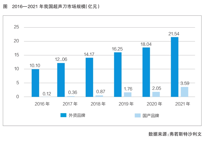 弗若斯特沙利文數據還顯示,我國超聲刀市場規(guī)模已從2016年的10.22億元增長至2021年的25.13億元,年復合增長率高達19.71%;其中,國產品牌市場規(guī)模增速較快,已從2016年的0.12億元增長至2021年的3.59億元(詳見圖)。