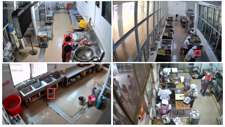 百色市食品安全智能服務(wù)平臺(tái)系統(tǒng)要求,學(xué)校食堂分別在后廚的切配區(qū)、烹飪區(qū)、洗消區(qū)安裝云攝像頭,通過互聯(lián)網(wǎng)接入平臺(tái),重點(diǎn)對學(xué)校食堂后廚加工的常見違規(guī)行為,如有害生物、未戴帽子、未戴口罩、吸煙、玩手機(jī)、未蓋垃圾桶蓋等,運(yùn)用AI智能可視化自動(dòng)抓拍,并將整改通知及時(shí)發(fā)送至轄區(qū)監(jiān)管人員和學(xué)校食品安全責(zé)任人手機(jī)上,督促其及時(shí)整改,確保了食材加工全視角的過程可控。