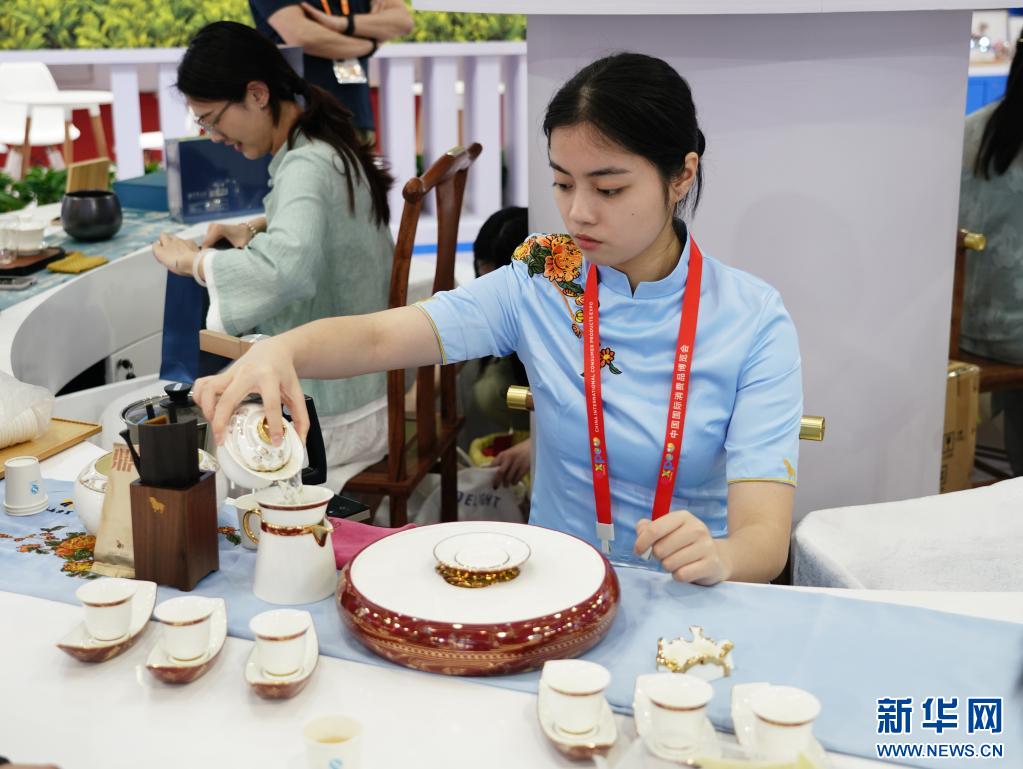 4月10日,消博會福建展臺的工作人員在為參觀者沏茶。當日,第三屆中國國際消費品博覽會在海南??陂_幕。本屆消博會以“共享開放機遇、共創(chuàng)美好生活”為主題,將助力消費恢復(fù)和升級,為各國企業(yè)共享中國市場提供機遇。新華社記者 樊雨晴 攝