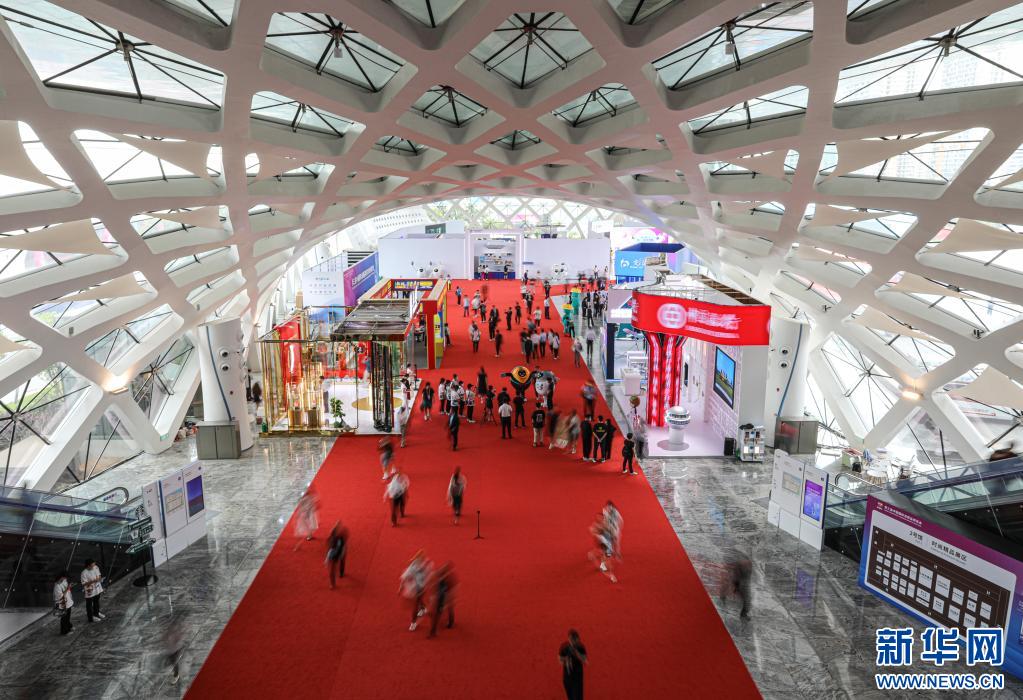 4月10日拍攝的第三屆中國國際消費品博覽會場館內(nèi)景。當日,第三屆中國國際消費品博覽會在海南??陂_幕。本屆消博會以“共享開放機遇、共創(chuàng)美好生活”為主題,將助力消費恢復(fù)和升級,為各國企業(yè)共享中國市場提供機遇。新華社記者 蒲曉旭 攝