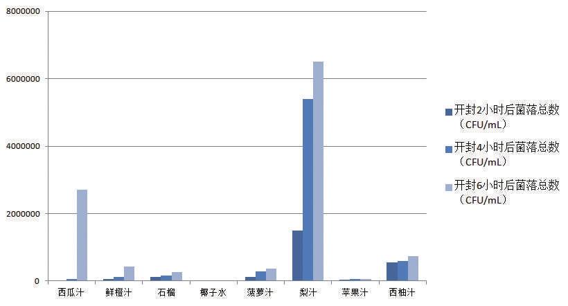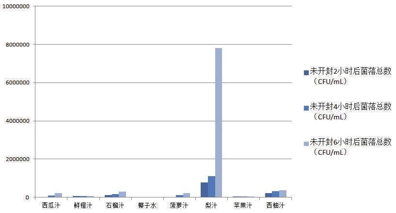 以鮮水果壓榨工藝制作的果汁,即鮮榨果汁,在開封喝過2小時(shí)后,有的菌落總數(shù)已經(jīng)超過國家標(biāo)準(zhǔn)規(guī)定限量,最高的一款梨汁達(dá)到了1500000CFU/ mL。其余未超過限量的鮮榨果汁,其菌落總數(shù)也隨著時(shí)間大量繁殖。開封喝過4小時(shí)、6小時(shí)后,大部分鮮榨果汁的菌落總數(shù)超過了國家標(biāo)準(zhǔn)規(guī)定限量的范圍,增長(zhǎng)速度最快的一款西瓜汁在開封6小時(shí)后菌落總數(shù)與開封2小時(shí)數(shù)據(jù)相比增長(zhǎng)了近586倍。