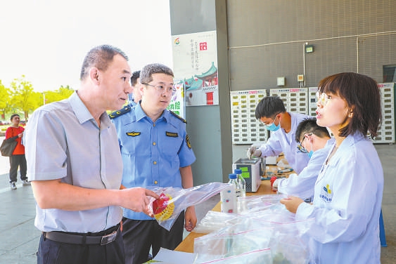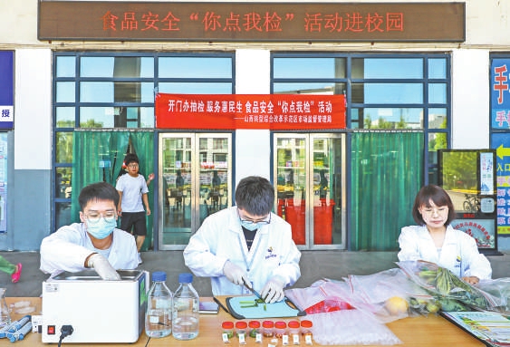 “您好,我們可以自己選擇檢測食品嗎?”6月21日,在太原學(xué)院餐廳門前,很多大學(xué)生圍在山西綜改區(qū)市場監(jiān)管局設(shè)立的“你點我檢”桌前向工作人員提問。該局食品監(jiān)管科副科長吳煒耐心給學(xué)生們講解:“沒問題,咱們掃碼后可以根據(jù)需求選擇,我們會根據(jù)大家的選擇進(jìn)行相關(guān)檢測。”幾位學(xué)生在吳煒的引導(dǎo)下進(jìn)行了操作,同時觀看了食品安全快檢流程?!拔覀兊牟妥谰涂磕銈儽O(jiān)督,必須給你們點贊!”幾位同學(xué)對市場監(jiān)管部門的工作表示贊揚。