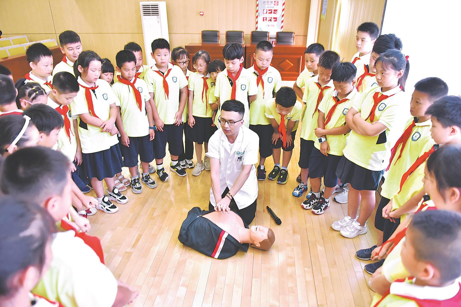 9月9日是2023年“世界急救日”。9月6日,合肥市振興小學(xué)開展“應(yīng)急救護(hù)進(jìn)校園”活動(dòng),邀請(qǐng)合肥市蜀山區(qū)健康巡講專家現(xiàn)場(chǎng)向師生傳授應(yīng)急救護(hù)技能和自動(dòng)體外除顫器的使用技巧等,普及急救知識(shí)。 通訊員 葛宜年 攝