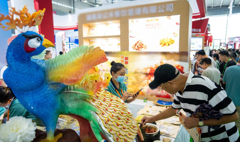 9月15日,在長沙國際會展中心,觀眾在品嘗小吃。