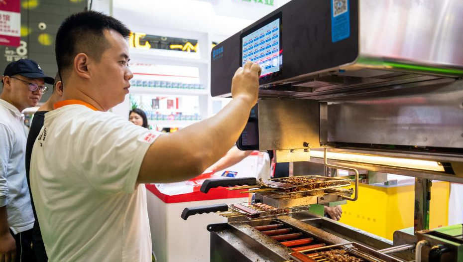 9月15日,在長沙國際會展中心,參展商在展示自動燒烤機(jī)操作方法。
