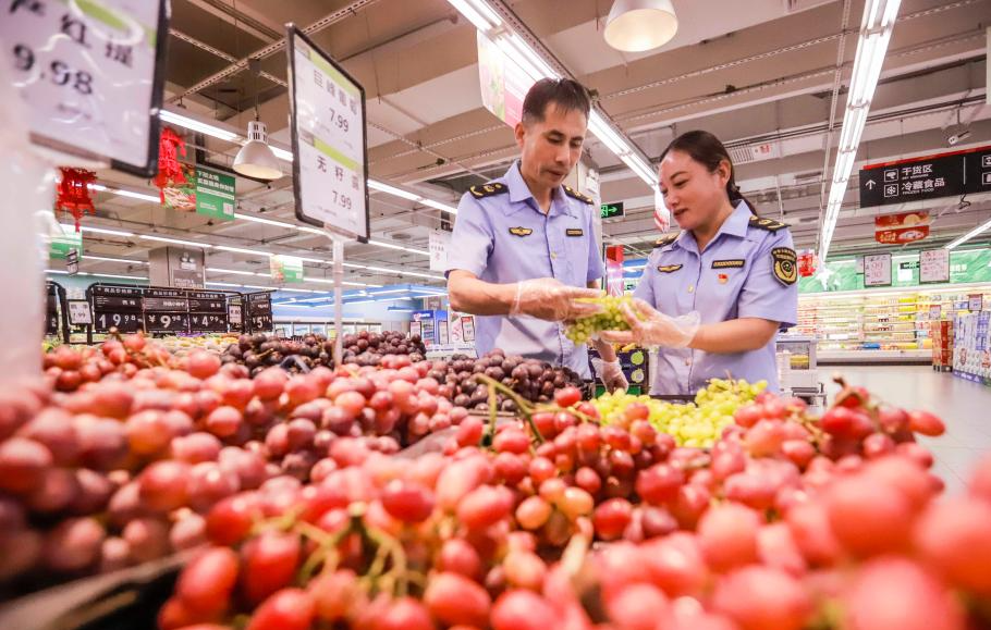9月22日,市場監(jiān)督管理局的工作人員在河北省遵化市的一家超市檢查水果質(zhì)量。