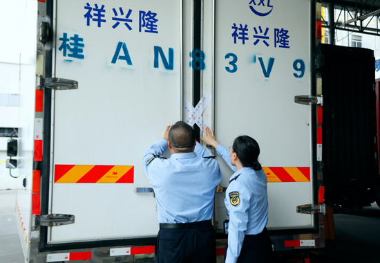 市場(chǎng)監(jiān)管部門駐點(diǎn)監(jiān)管人員對(duì)準(zhǔn)備發(fā)往學(xué)青會(huì)運(yùn)動(dòng)員村的食品專用運(yùn)輸車輛張貼封條。何正君攝