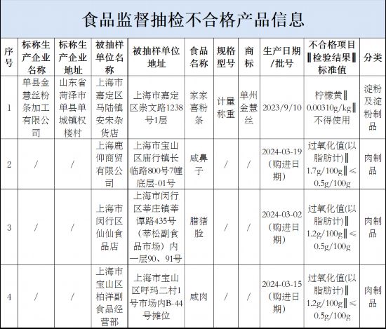 粉條、咸肉 滬市場監(jiān)管局抽檢4批次食品不合格