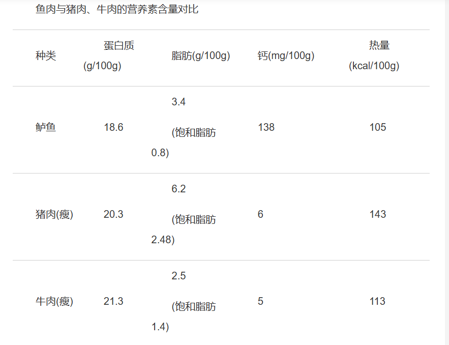 魚肉作為“白肉”的一種,比起豬牛羊肉來說,熱量和飽和脂肪的含量更低,鈣等礦物質(zhì)的含量相對更高,可以作為減重、減脂期的優(yōu)質(zhì)蛋白質(zhì)來源。