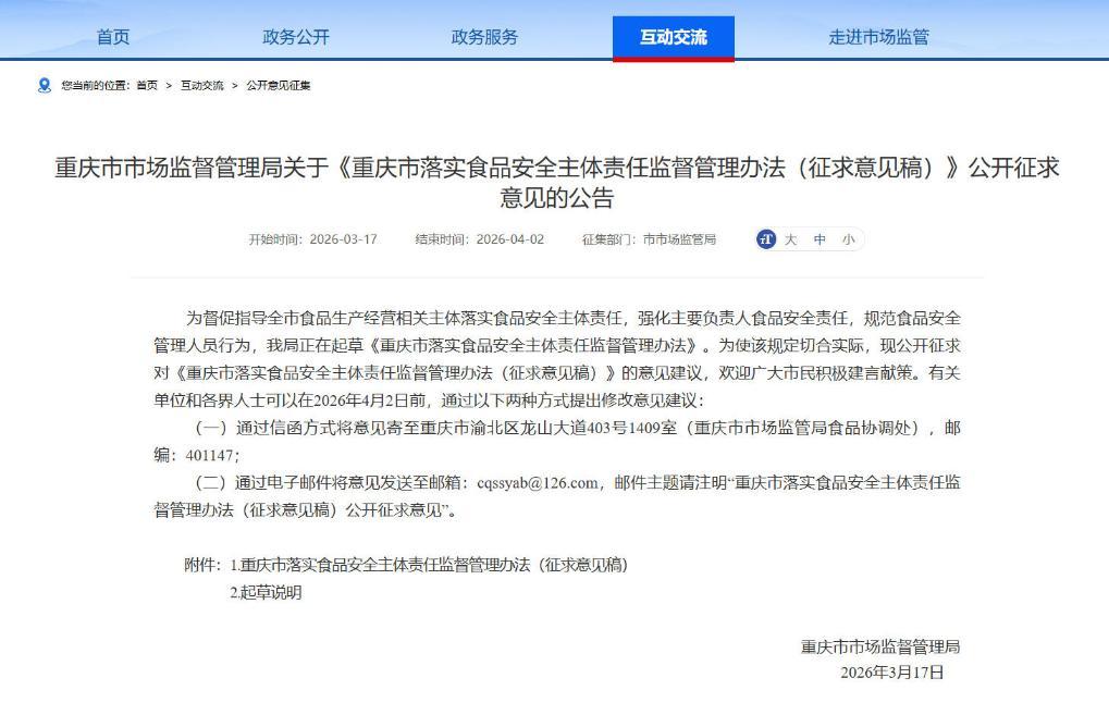 為進一步梳理、細化、規(guī)范各類食品生產(chǎn)經(jīng)營主體的食品安全主體責(zé)任制要求,持續(xù)推動食品安全風(fēng)險防線前移,不斷提升食品安全管控質(zhì)效,近日,重慶市市場監(jiān)督管理局起草了《重慶市落實食品安全主體責(zé)任監(jiān)督管理辦法(征求意見稿)》(以下簡稱《辦法》),現(xiàn)向社會公開征求意見建議。