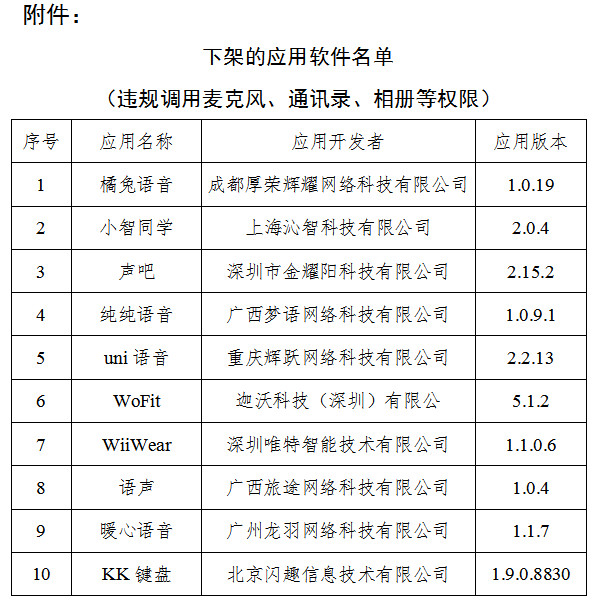 依據(jù)《網(wǎng)絡(luò)安全法》和《移動智能終端應(yīng)用軟件預(yù)置和分發(fā)管理暫行規(guī)定》(工信部信管〔2016〕407號)等法律和規(guī)范性文件要求,工信部組織對上述10款A(yù)PP進行下架。相關(guān)應(yīng)用商店應(yīng)在本通報發(fā)布后,立即組織對名單中應(yīng)用軟件進行下架處理。