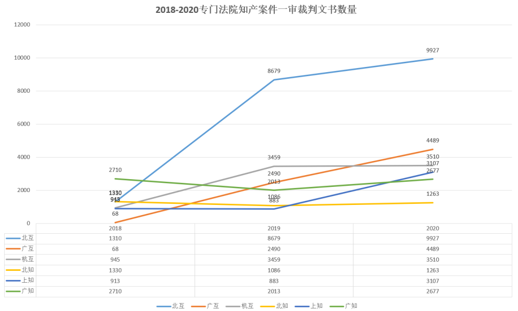 從整體趨勢上看,6個專門法院中除廣知外均呈現(xiàn)上升趨勢;三大互聯(lián)法院裁判文書的總數(shù)量整體高于三大知識產(chǎn)權(quán)法院。其中,北互、廣互從2018-2020年數(shù)據(jù)呈現(xiàn)一個快速攀升的趨勢,北互的裁判文書數(shù)量從1310上升到9927,廣互的裁判文書數(shù)量從68上升到4489。