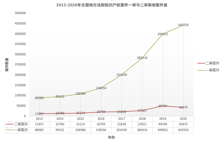 根據(jù)最高人民法院各年度知識產(chǎn)權(quán)司法保護(hù)白皮書(2013-2020年)的公開數(shù)據(jù),本報(bào)告總結(jié)了這八年的總體收案情況(表一)??傮w而言,全國地方法院知識產(chǎn)權(quán)案件一審與二審新收案件量均呈現(xiàn)逐年遞增趨勢,其中一審新收案件量從2013年的88583件,增長至2020年的443326件,增長約4倍;二審新收案件量從2013年的11957件,增長至2020年的42975件,增長約2.6倍。此外,一審案件數(shù)量增幅明顯大于二審案件數(shù)量,一定程度上反映了我國一審案件審判質(zhì)效逐步提高,多數(shù)知識產(chǎn)權(quán)案件在一審階段得到解決。