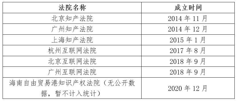 在設(shè)立時(shí)間上,知識產(chǎn)權(quán)專門法院要早于互聯(lián)網(wǎng)專門法院,6家專門法院的設(shè)立時(shí)間如表五。