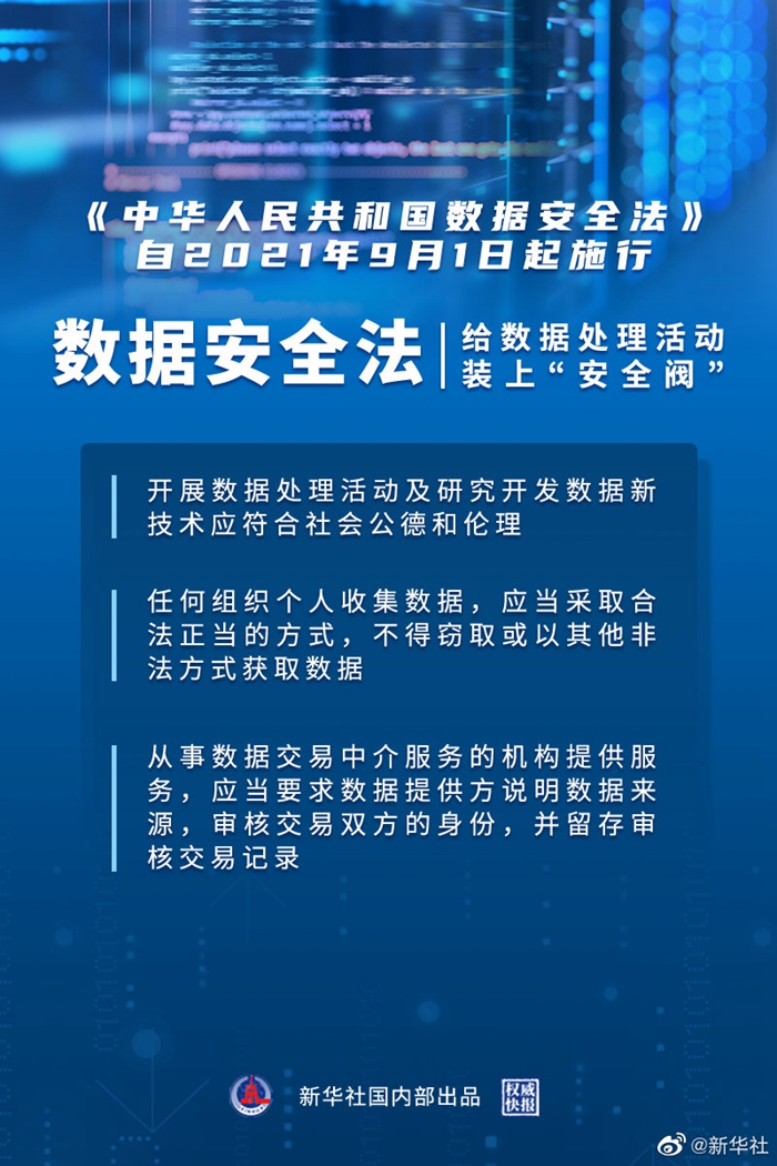 個人數(shù)據(jù)被不法分子竊取、買賣的問題咋破解?數(shù)據(jù)安全法自9月1日起施行,明確:①國家建立數(shù)據(jù)分類分級保護(hù)制度。②開展數(shù)據(jù)處理活動以及研究開發(fā)數(shù)據(jù)新技術(shù),應(yīng)當(dāng)有利于促進(jìn)經(jīng)濟(jì)社會發(fā)展,增進(jìn)人民福祉,符合社會公德和倫理。③國家建立健全數(shù)據(jù)交易管理制度,規(guī)范數(shù)據(jù)交易行為,培育數(shù)據(jù)交易市場。④不得竊取或以其他非法方式獲取數(shù)據(jù);數(shù)據(jù)交易中介服務(wù)機(jī)構(gòu)應(yīng)要求數(shù)據(jù)提供方說明數(shù)據(jù)來源、審核交易雙方身份。⑤國家機(jī)關(guān)應(yīng)建立健全數(shù)據(jù)安全管理制度,保障政務(wù)數(shù)據(jù)安全。愈加嚴(yán)密的法律體系,讓你我“觸網(wǎng)”無憂!(記者白陽,海報設(shè)計楊軼群)