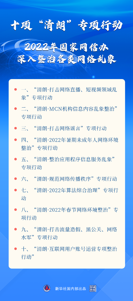 新華社北京3月17日電(記者王思北)記者17日從國(guó)新辦舉行的新聞發(fā)布會(huì)獲悉,2022年“清朗”系列專(zhuān)項(xiàng)行動(dòng)將重點(diǎn)開(kāi)展打擊網(wǎng)絡(luò)謠言,打擊網(wǎng)絡(luò)直播、短視頻領(lǐng)域亂象,算法綜合治理,暑期未成年人網(wǎng)絡(luò)環(huán)境整治等十方面任務(wù)。