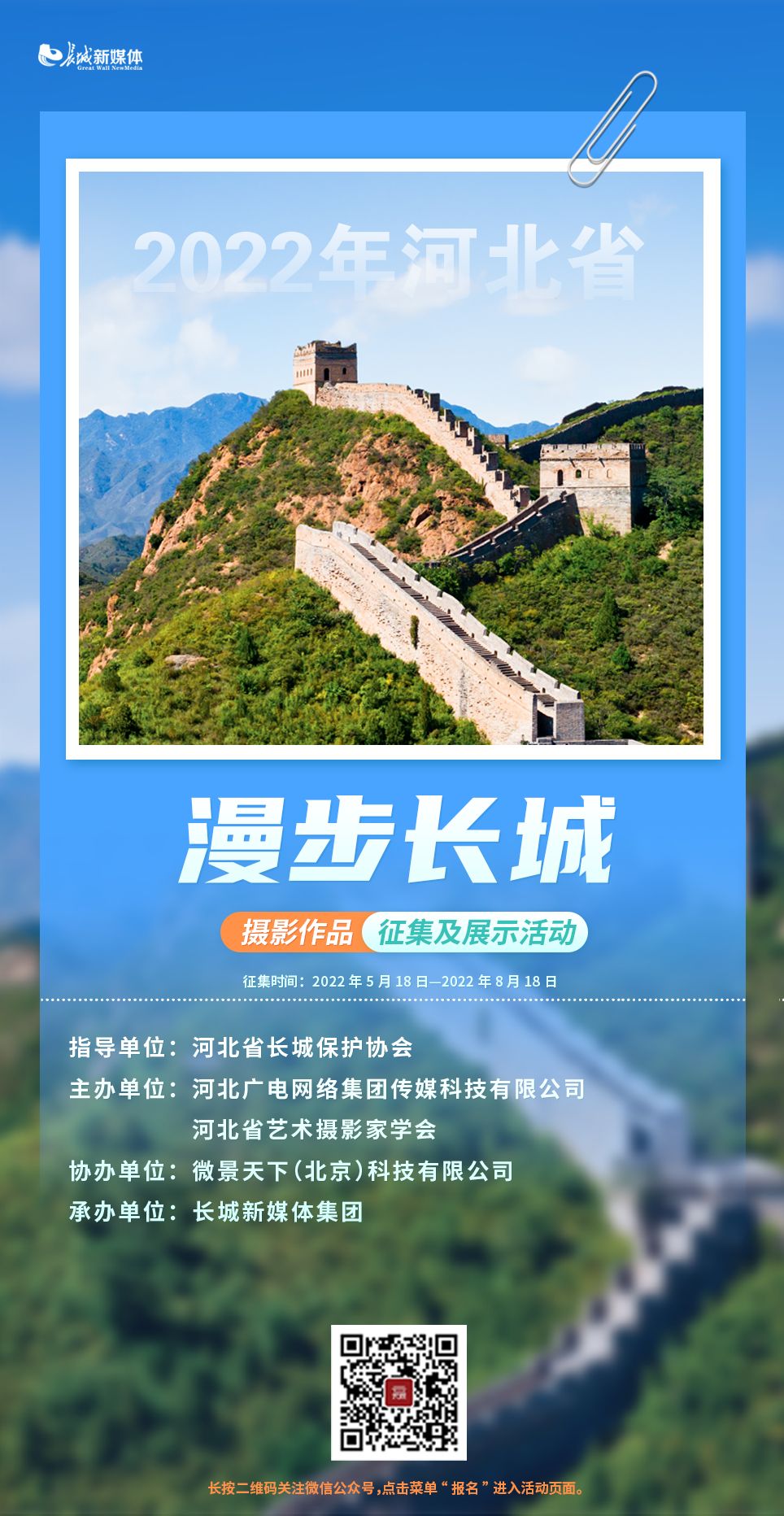 本次活動面向全社會公開征集河北省境內(nèi)的長城主題攝影作品,分為專業(yè)組和業(yè)余組兩個組別。專業(yè)組參與者可使用專業(yè)航拍器、單反相機進行作品拍攝,不可使用包括手機在內(nèi)的其他拍照設(shè)備。業(yè)余組參與作品主要是以手機或相機等設(shè)備拍攝為主。