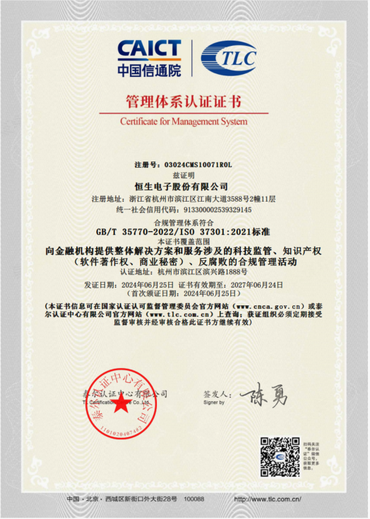 恒生電子股份有限公司的主要業(yè)務(wù)是向金融機構(gòu)提供整體解決方案和服務(wù),此次認(rèn)證范圍覆蓋了主要業(yè)務(wù)涉及的科技監(jiān)管、軟件著作權(quán)、商業(yè)秘密、反腐敗的合規(guī)管理活動。ISO 37301是國際通用的合規(guī)管理體系認(rèn)證標(biāo)準(zhǔn),規(guī)定了組織建立、運行、保持和改進(jìn)合規(guī)管理體系的要求,獲得該認(rèn)證,表明恒生公司具備了該標(biāo)準(zhǔn)所要求的合規(guī)管理水平及能力。