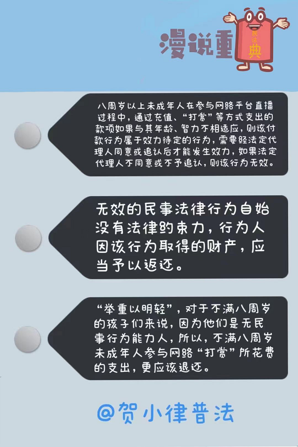 最高人民法院《關(guān)于依法妥善審理涉新冠肺炎疫情民事案件若干問題的指導(dǎo)意見(二)》明確,八周歲以上的未成年人未經(jīng)其監(jiān)護(hù)人同意,參與網(wǎng)絡(luò)付費(fèi)游戲或者網(wǎng)絡(luò)直播平臺“打賞”等方式支出與其年齡、智力不相適應(yīng)的款項(xiàng),監(jiān)護(hù)人請求網(wǎng)絡(luò)服務(wù)提供者返還該款項(xiàng)的,人民法院應(yīng)予支持。