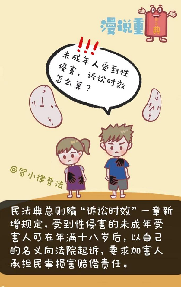 《中華人民共和國民法典》第一百九十一條 【未成年人遭受性侵害的損害賠償訴訟時(shí)效的起算】未成年人遭受性侵害的損害賠償請求權(quán)的訴訟時(shí)效期間,自受害人年滿十八周歲之日起計(jì)算。
