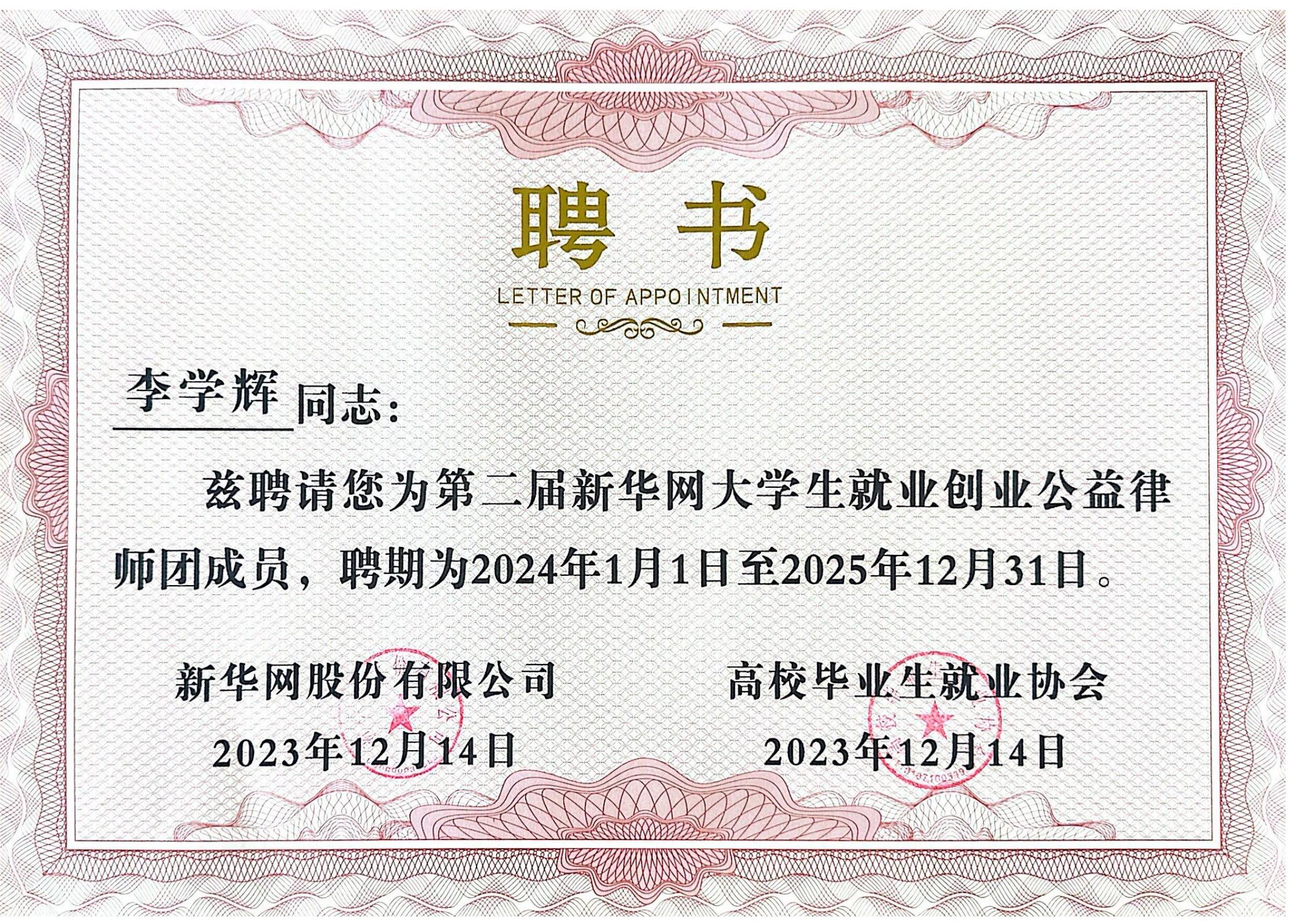 北京市安理律師事務(wù)所黨委副書記、管委會委員李學(xué)輝律師憑借扎實(shí)的法律功底、過硬的專業(yè)素養(yǎng)、應(yīng)有的責(zé)任擔(dān)當(dāng),受聘擔(dān)任新華網(wǎng)大學(xué)生就業(yè)創(chuàng)業(yè)公益律師團(tuán)成員。
