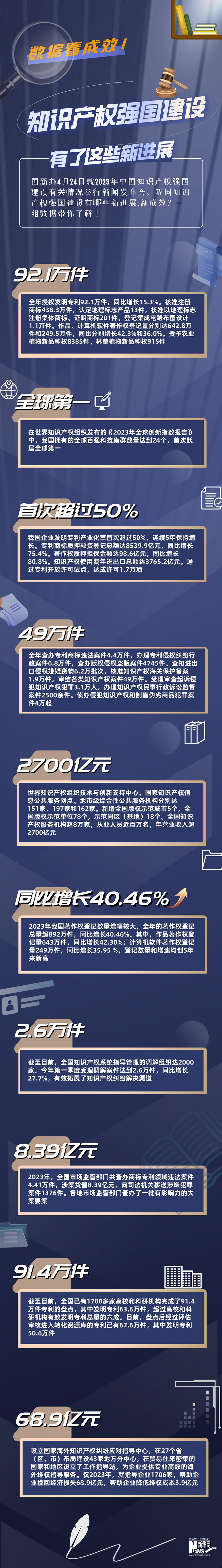 國(guó)新辦4月24日就2023年中國(guó)知識(shí)產(chǎn)權(quán)強(qiáng)國(guó)建設(shè)有關(guān)情況舉行新聞發(fā)布會(huì)。我國(guó)知識(shí)產(chǎn)權(quán)強(qiáng)國(guó)建設(shè)有哪些新進(jìn)展、新成效?一組數(shù)據(jù)帶你了解!
