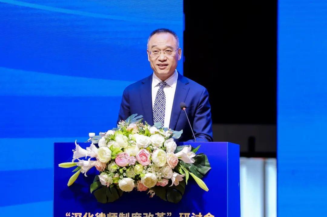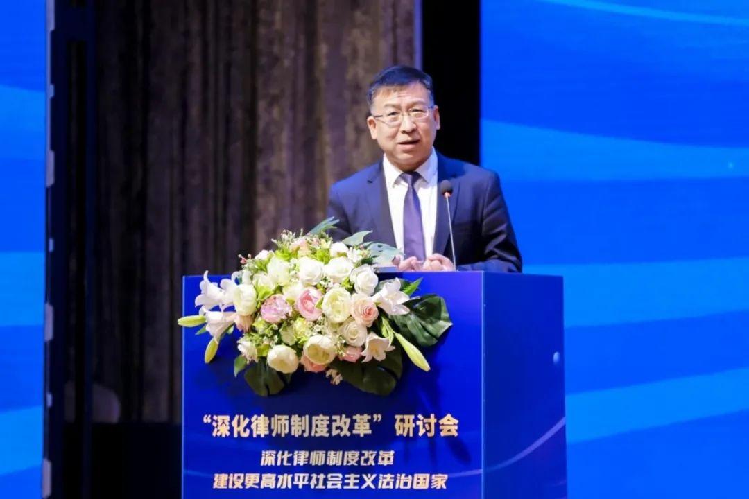 十三屆全國(guó)人大常委會(huì)副秘書(shū)長(zhǎng)、監(jiān)察和司法委員會(huì)副主任委員、中國(guó)法學(xué)會(huì)律師法學(xué)研究會(huì)會(huì)長(zhǎng)韓曉武在致辭中表示,此次研討會(huì)以“深化律師制度改革,建設(shè)更高水平的社會(huì)主義法治國(guó)家”為核心思想,旨在于進(jìn)一步直面我國(guó)律師行業(yè)發(fā)展中的問(wèn)題,共同探討律師制度改革的新方向。韓曉武強(qiáng)調(diào),深化律師制度改革,要堅(jiān)持政治引領(lǐng)和強(qiáng)有力的理論支撐,服務(wù)大局,關(guān)注律師行業(yè)管理體制現(xiàn)代化;廣大律師在發(fā)展新質(zhì)生產(chǎn)力中承擔(dān)重要責(zé)任,需積極發(fā)展涉外法律服務(wù),助力我國(guó)涉外法治建設(shè)。