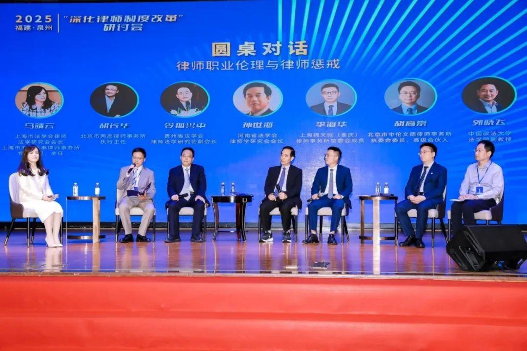 在圓桌對(duì)話環(huán)節(jié)中,北京市兩高律師事務(wù)所執(zhí)行主任胡長(zhǎng)華、貴州省法學(xué)會(huì)律師法學(xué)研究會(huì)副會(huì)長(zhǎng)令狐興中、河南省法學(xué)會(huì)律師學(xué)研究會(huì)會(huì)長(zhǎng)孫世海、上海錦天城(重慶)律師事務(wù)所管委會(huì)成員李海華、北京市中倫文德律師事務(wù)所執(zhí)委會(huì)委員、高級(jí)合伙人胡高崇、中國(guó)政法大學(xué)法學(xué)院副教授郭曉飛圍繞“律師職業(yè)倫理與律師懲戒”進(jìn)行交流,上海市法學(xué)會(huì)律師法學(xué)研究會(huì)會(huì)長(zhǎng)、上海市海華永泰律師事務(wù)所黨委書(shū)記、主任馬靖云主持。