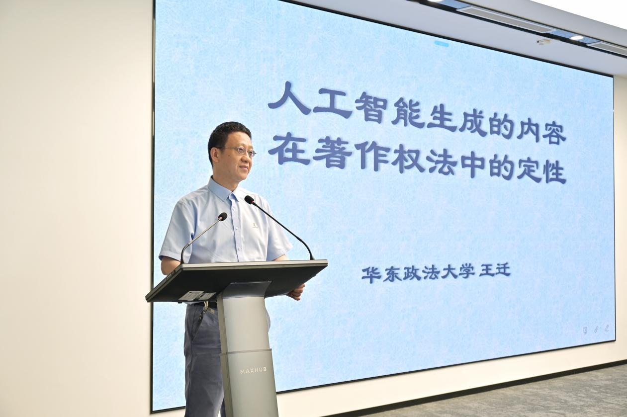 在四個(gè)小時(shí)的課程講解中,王遷教授就其觀點(diǎn)系統(tǒng)梳理了人工智能技術(shù)在內(nèi)容生成、數(shù)據(jù)處理等領(lǐng)域帶來(lái)的著作權(quán)法新挑戰(zhàn)。他圍繞AI生成內(nèi)容的可版權(quán)性認(rèn)定、權(quán)利歸屬、訓(xùn)練數(shù)據(jù)使用的合法性邊界、AI“創(chuàng)作”對(duì)傳統(tǒng)著作權(quán)制度的沖擊與調(diào)適等核心議題,進(jìn)行了鞭辟入里的分析。不僅闡釋了現(xiàn)行法律框架下的理論難點(diǎn),更結(jié)合國(guó)內(nèi)外最新立法動(dòng)態(tài)、司法判例及產(chǎn)業(yè)實(shí)踐,提出了富有洞見的思考方向與可能的解決路徑。