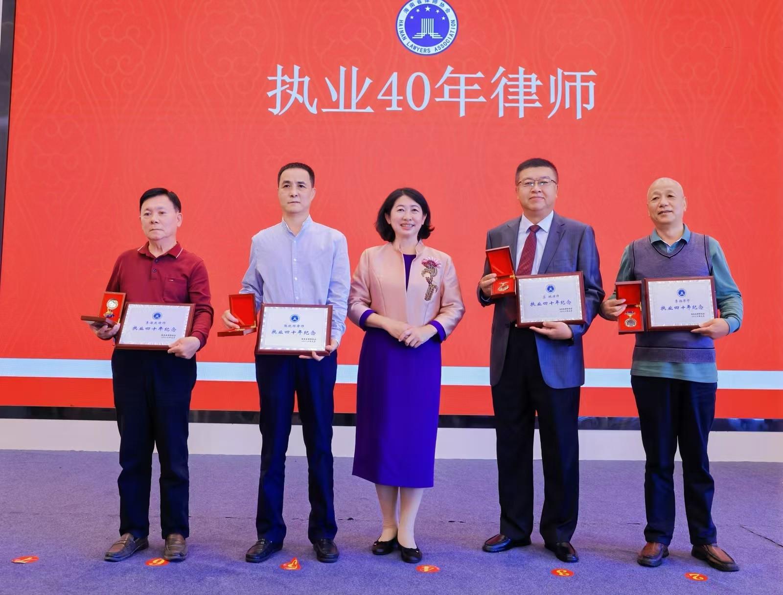 在熱烈的掌聲中,執(zhí)業(yè)滿30年、35年、40年的律師代表以及在律師行業(yè)行政崗位工作滿15年的代表分批上臺,接過記載執(zhí)業(yè)歷程的紀(jì)念證章和牌匾。他們中,有人兩鬢已生華發(fā),但眼神依然銳利而堅(jiān)定。