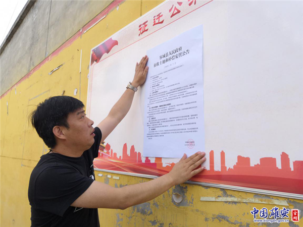 征收土地和補(bǔ)償安置公告,主要包括項(xiàng)目批準(zhǔn)情況、被征收土地情況、土地補(bǔ)償情況、房屋及附屬物、附著物及青苗補(bǔ)償情況、安置辦法和其他事項(xiàng)等六部分內(nèi)容。圖為駐村干部在小王營村張貼公告。中國雄安官網(wǎng)記者劉東堯 攝