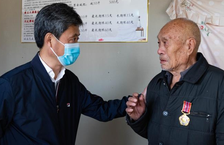 84歲的徐敏老人17歲應(yīng)征入伍,參加過抗美援朝戰(zhàn)役。他雖然年事已高,但仍然精神抖擻、聲音洪亮。高立春一行來到徐敏家中,與他親切交談,并送上米、面、油、牛奶等慰問品。高立春對老人投身抗美援朝、經(jīng)歷浴血奮戰(zhàn)的大無畏精神表示敬意,感謝他們?yōu)樾轮袊鞒龅呢暙I(xiàn),并親自為他佩戴上“中國人民志愿軍抗美援朝出國作戰(zhàn)70周年”紀(jì)念章。同時,高立春還要求相關(guān)部門和工作人員要時刻關(guān)心、照顧好老人,及時主動地幫助老人解決生活困難,并叮囑老人有任何困難第一時間找退役軍人服務(wù)中心這個“娘家人”。