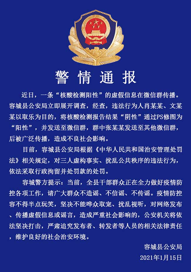 人民網(wǎng)雄安1月15日 (王紅 何美萱)據(jù)雄安新區(qū)容城縣公安局消息,容城縣3人因傳播“核酸檢測(cè)陽性”虛假信息被行政拘留并處罰款。