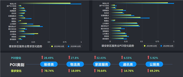 家政、通訊、公廁等POI數(shù)量則分別增長了32.43%、6.55%、5.92%。這些從側(cè)面反映出,雄安新區(qū)建設(shè)大軍的涌入,帶動了當(dāng)?shù)叵M(fèi)需求的增長和消費(fèi)能力的提升。