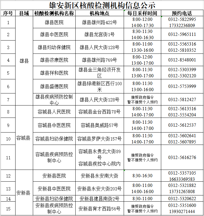 雄安新區(qū)核酸檢測機構(gòu)信息公示
