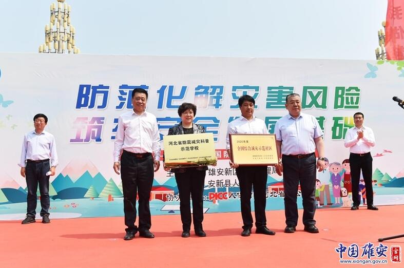 在全國防災(zāi)減災(zāi)日宣傳活動現(xiàn)場,戴泊生向安新小學(xué)頒發(fā)省級地震科普教育示范學(xué)校牌匾,劉樹軍向東淀頭村頒發(fā)全國綜合減災(zāi)示范社區(qū)牌匾,兩位領(lǐng)導(dǎo)共同向雄州救援隊、雄風(fēng)救援隊、藍天救援隊、美團代表隊等新區(qū)安全宣傳志愿者隊伍代表授旗。中國人民財產(chǎn)保險股份有限公司雄安分公司籌建負(fù)責(zé)人張友林為活動致開幕詞,中國福利基金會支持雄安公益基金執(zhí)行主任、北京支持雄安產(chǎn)業(yè)發(fā)展促進會常務(wù)副會長兼秘書長彌雪向雄安新區(qū)捐贈了高空細(xì)水霧滅火消防車。