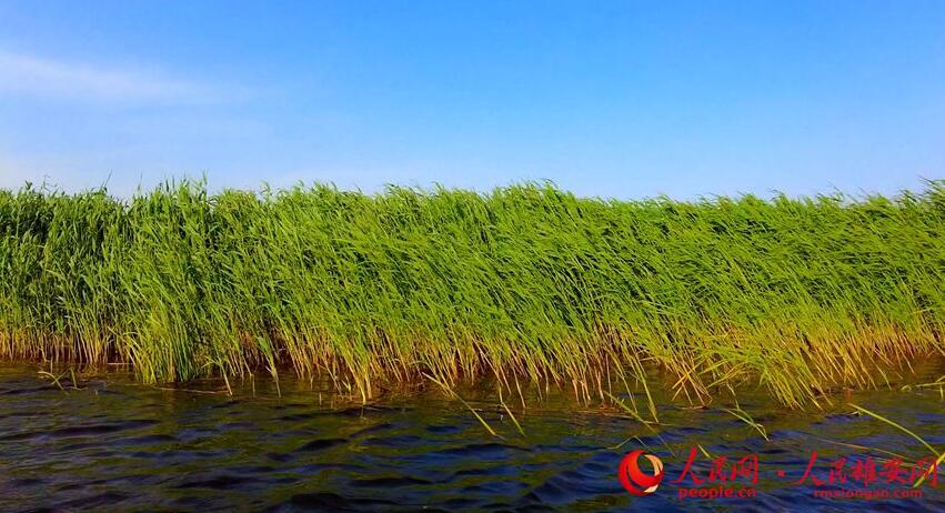 清澈的白洋淀與蘆葦,形成一幅藍綠交織的美好畫卷。高騰攝