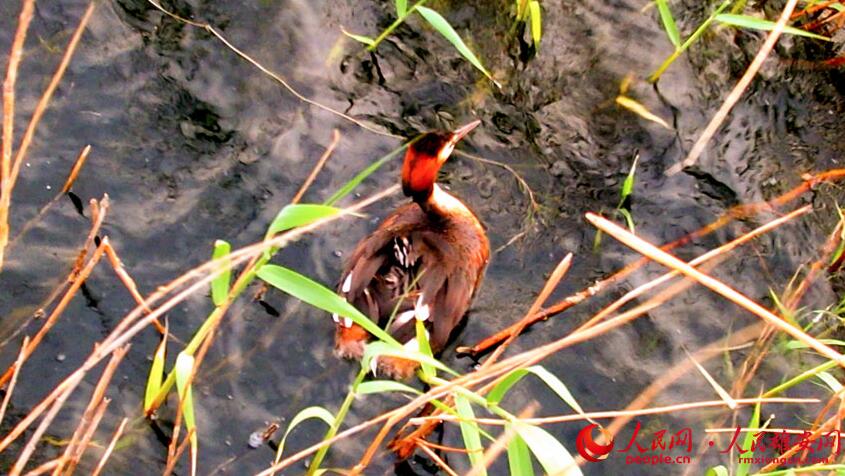 鳥兒背負雛鳥穿梭于蘆葦蕩中,畫面溫馨有愛。高騰攝