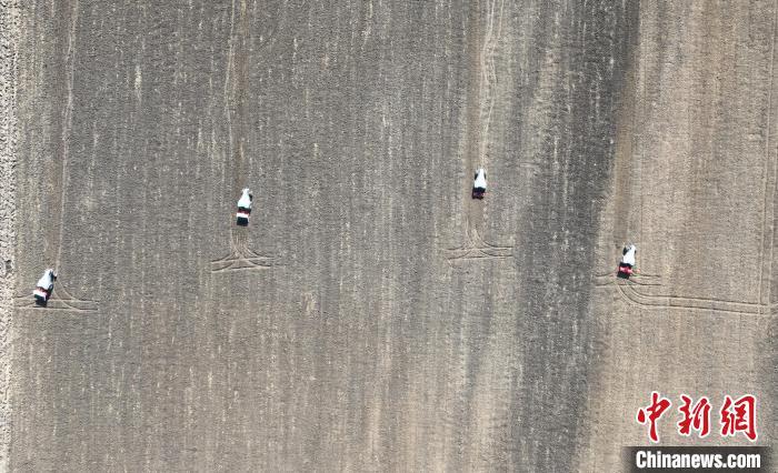 10月22日,河北雄安新區(qū)安新縣端村鎮(zhèn)關(guān)城二村一農(nóng)田內(nèi),幾臺(tái)“鴻鵠T70”電動(dòng)智能拖拉機(jī)正在進(jìn)行秋播作業(yè)。(無(wú)人機(jī)照片)中新社記者 韓冰 攝