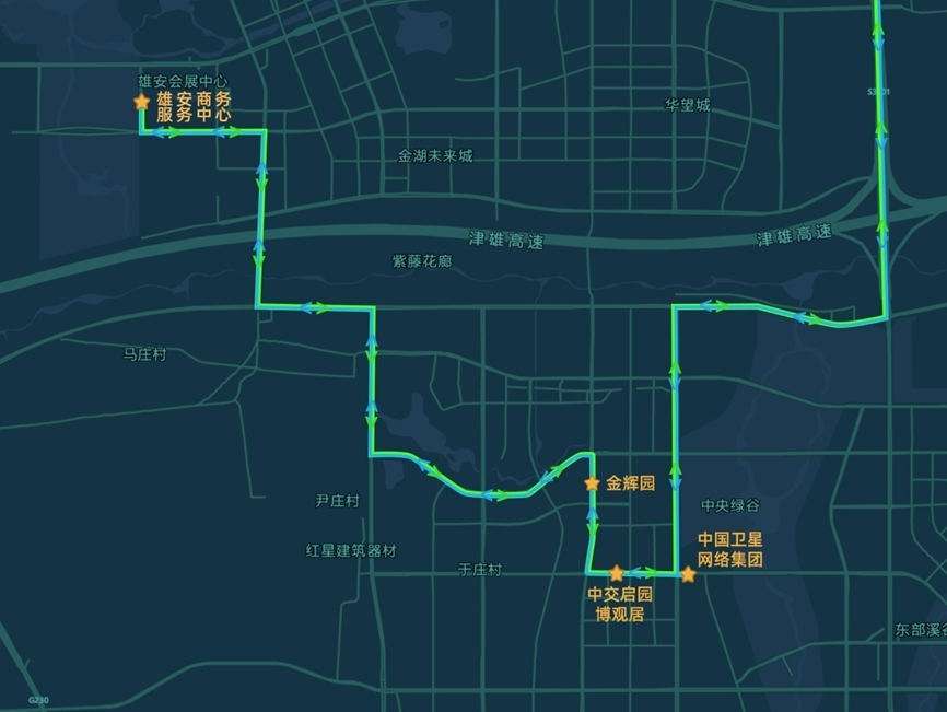 雄安新區(qū)設(shè)置4個(gè)上下客站點(diǎn),從雄安商服中心站始發(fā),途經(jīng)博觀居站、金輝園站、中國(guó)星網(wǎng)站。