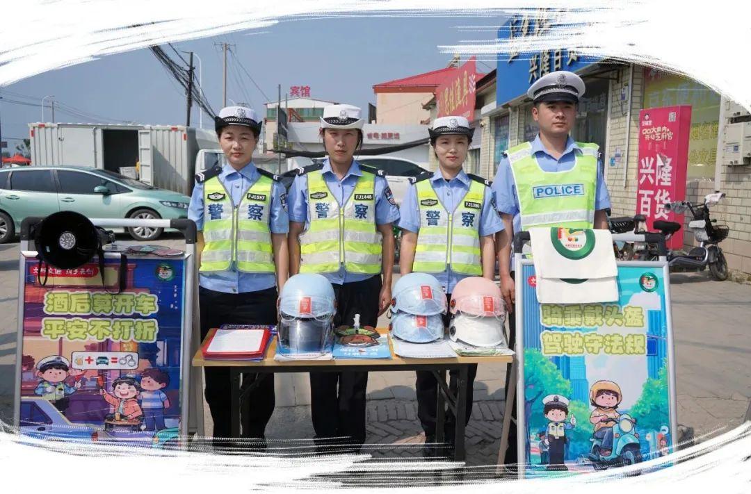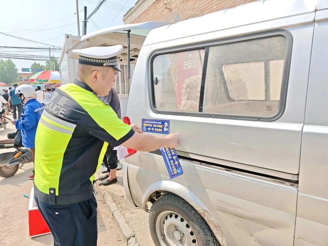 穿梭在集市車(chē)流中,民警為來(lái)往車(chē)輛貼上醒目標(biāo)語(yǔ):“喝酒不開(kāi)車(chē),開(kāi)車(chē)不喝酒;一盔一帶,安全常在”。